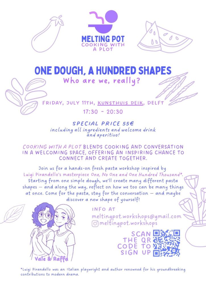 In deze interactieve workshop maken we samen verse pasta, geïnspireerd op Luigi Pirandello’s meesterwerk “Eén, Niemand en Honderdduizend”. We starten met één eenvoudig deeg – en vormen daaruit allerlei verschillende pastavormen.